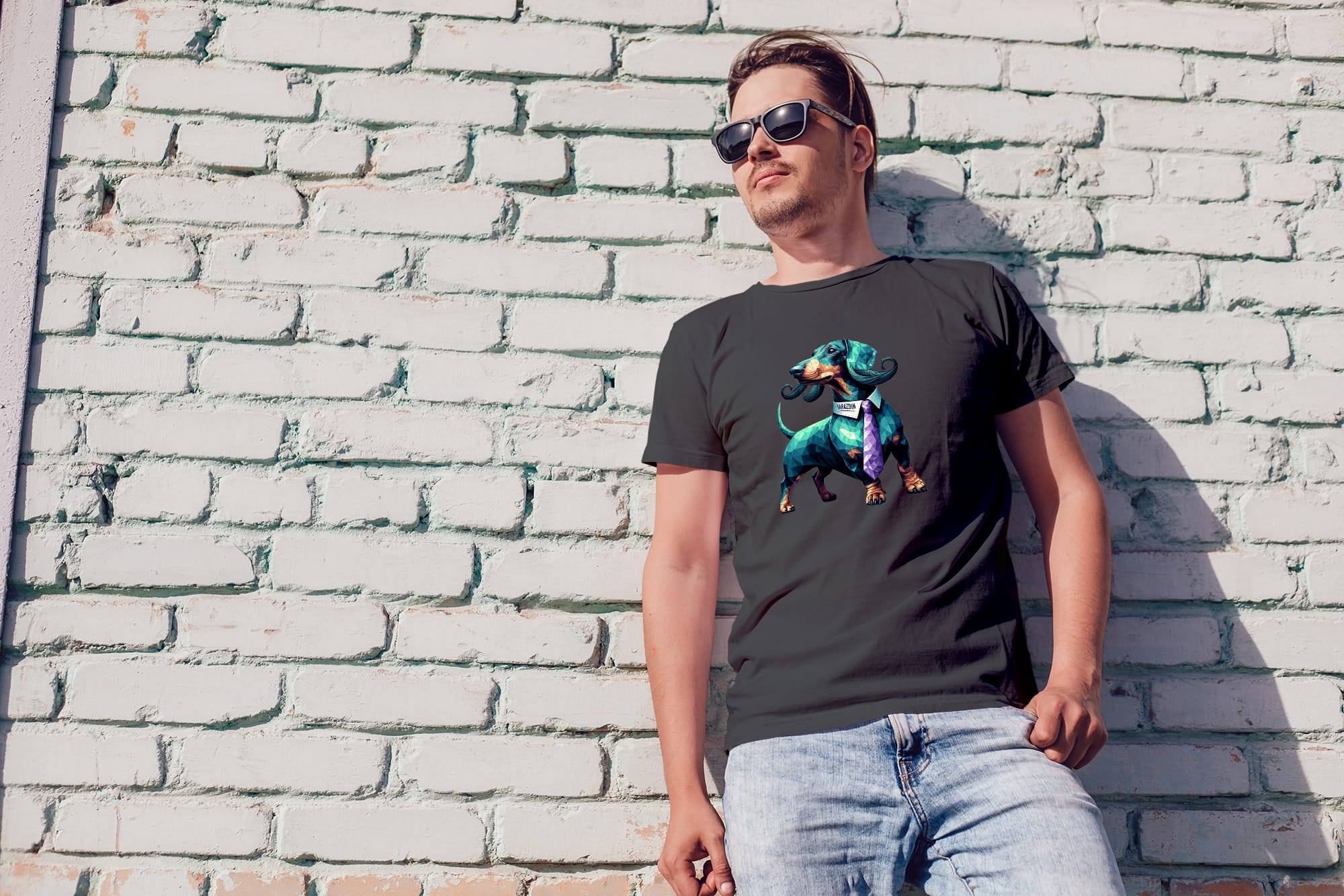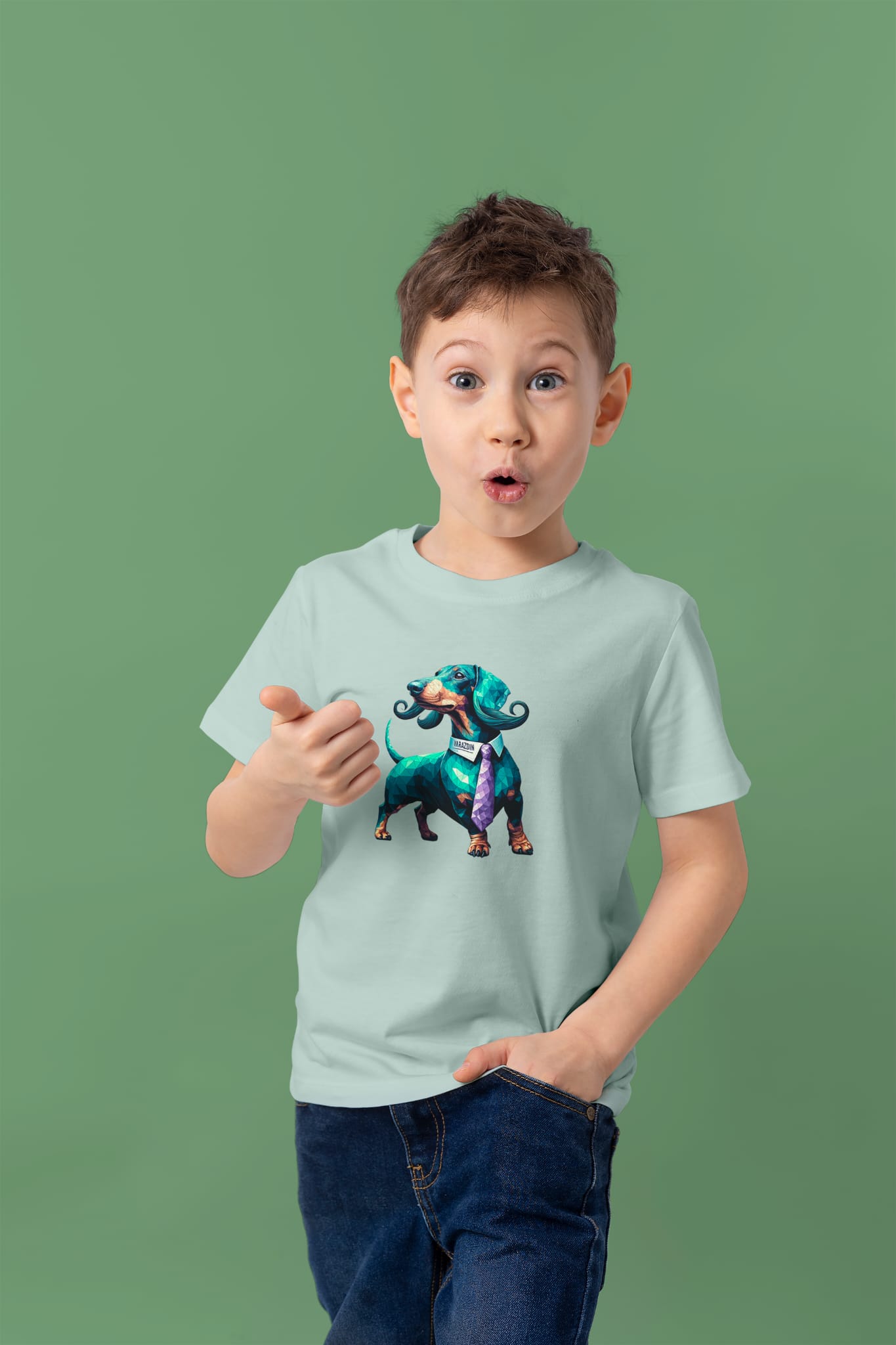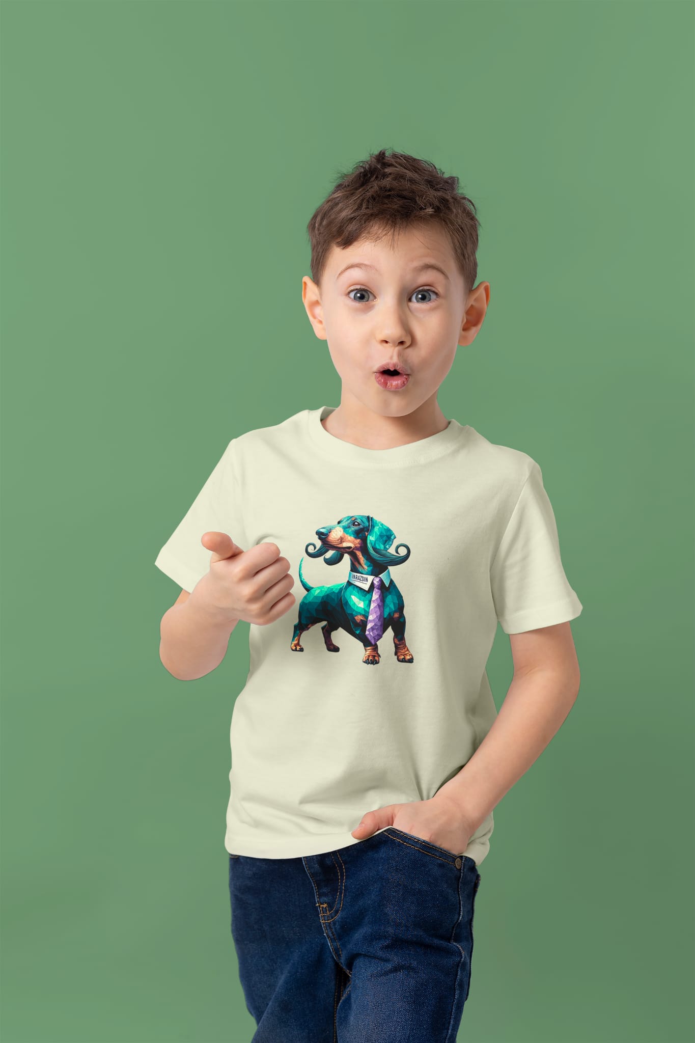 Doogi je naš jazavčar. Retro "Proud", geometric low-poly s brkovima grofa, rainbow za djecu. €2 od svake prodaje → lokalno sklonište.
