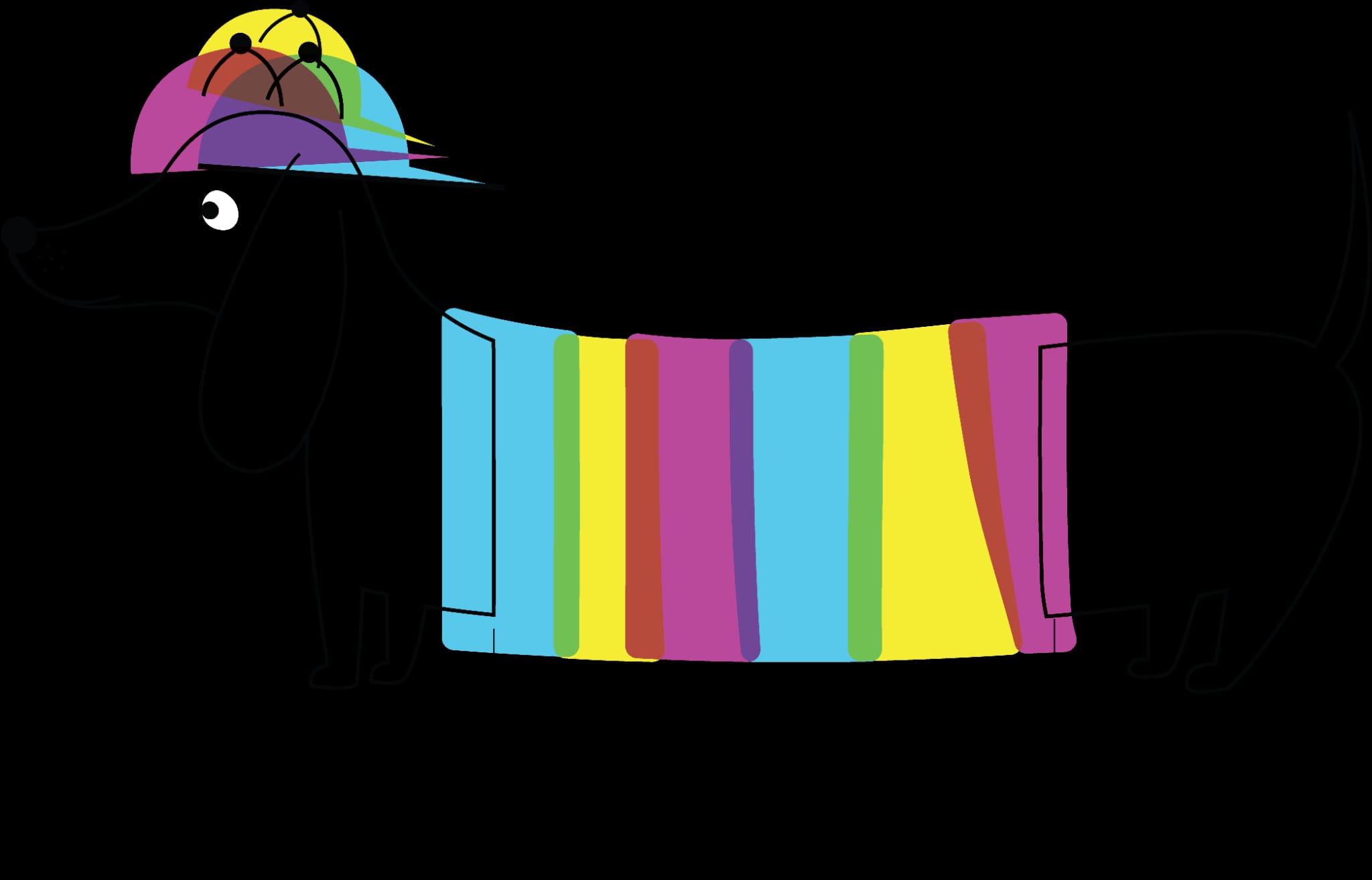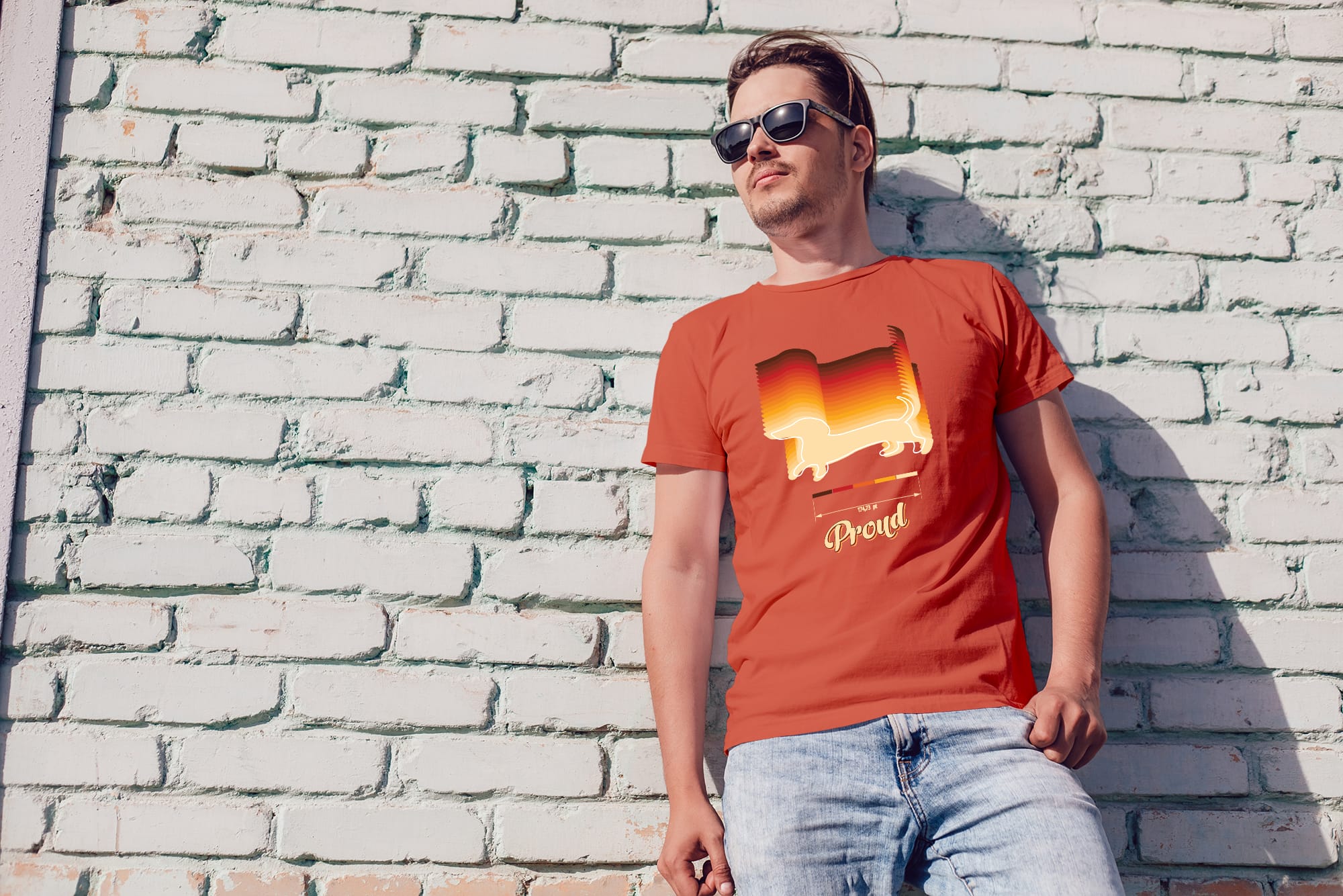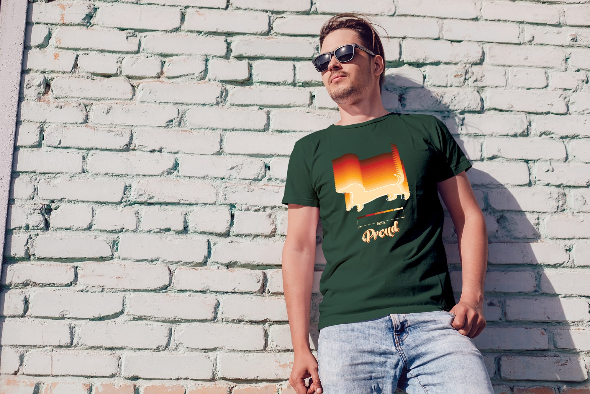 Doogi je naš jazavčar. Retro "Proud", geometric low-poly s brkovima grofa, rainbow za djecu. €2 od svake prodaje → lokalno sklonište.