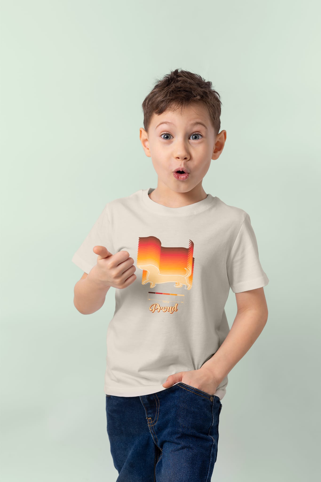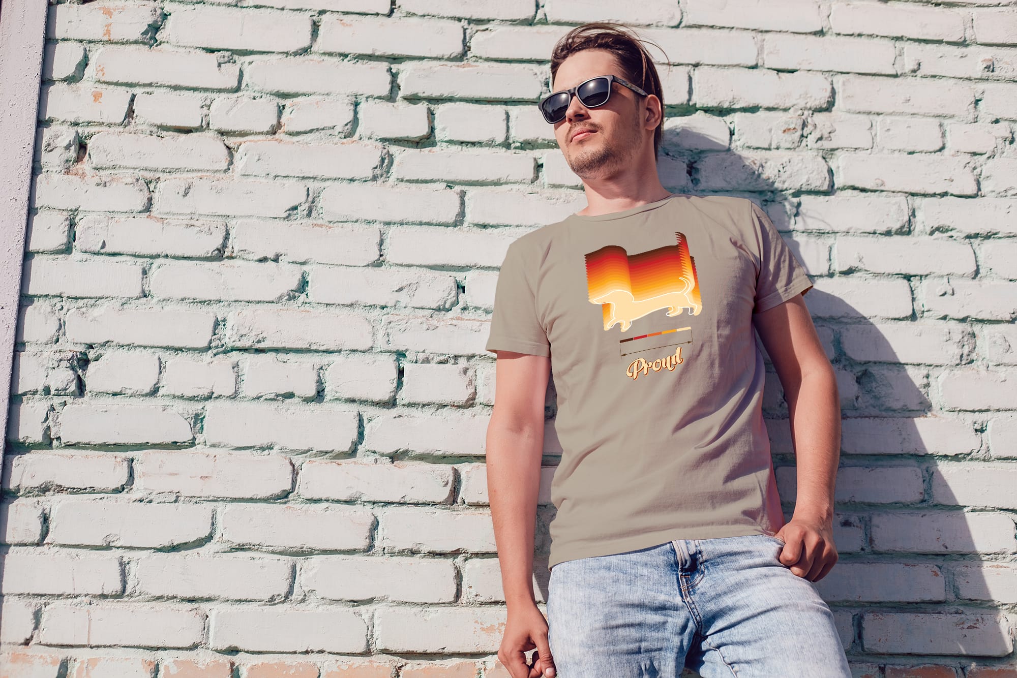 Sunset gradient jazavčar silueta s natpisom "Proud". Dostupna u zelenoj, crvenoj i bež. €2 od svake kupnje ide skloništu za životinje.